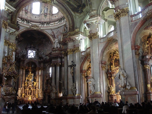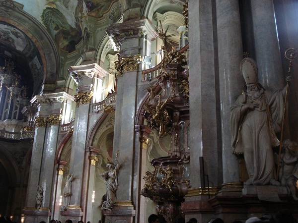 O interior é sumptuoso e surpreende pela riqueza espetacular das suas decorações, recheado de estátuas, pinturas e afrescos, inspirado na Capela de São Luís dos Inválidos de Paris. Na abóbada, o imponente trompe afresco de J. L Kracker representa a Apoteósis de São Nicolas (por seus 1500 m2 é considerado como um dos maiores da Europa). Sua esplêndida cúpula tem 49 metros de altura e 20 metros de diâmetro. O púlpito rocócó com anjos e querubins foi feito por Peter e Richard Prachner em 1765. Há belas pinturas no teto que mostram cenas da vida de São Nicolau e São Benedito, bem como um fantástico candelabro.
