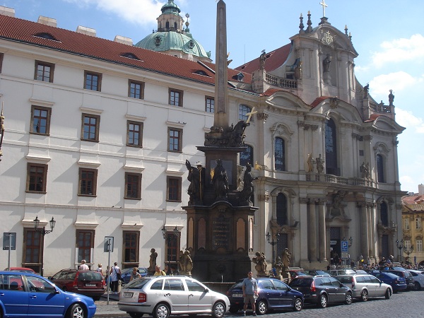 Construída por luteranos entre 1611-13, a Igreja da Santíssima Trindade é a primeira igreja barroca de Praga. Em 1620, com a derrota tcheca na Batalha da Montanha Branca (luta entre católicos e protestantes durante a Guerra dos Trinta Anos), a igreja é tomada dos protestantes e dada à Ordem Católica das Carmelitas Descalças, quando passou a ser chamada de Nossa Senhora da Vitória. As carmelitas reconstruíram o plano da igreja de forma radical, mudando a orientação e a fachada (inspiradas pela Santa Maria della Victoria de Roma, igreja de arquitetura romana cuja história também está ligada à Batalha da Montanha Branca).